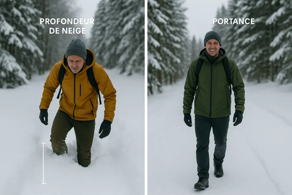 Le test de portance, simple mais révélateur, consiste à marcher 50 mètres hors sentier battu. Enfoncement <10 cm = portance excellente, progression sans raquettes viable. Enfoncement 10-20 cm = limite acceptable, fatigue accrue mais praticable. Enfoncement >20 cm = raquettes obligatoires, entêtement sans équipement condamne à épuisement rapide ou rebroussement honteux. Cette évaluation terrain, effectuée début sortie, détermine faisabilité objectivement.