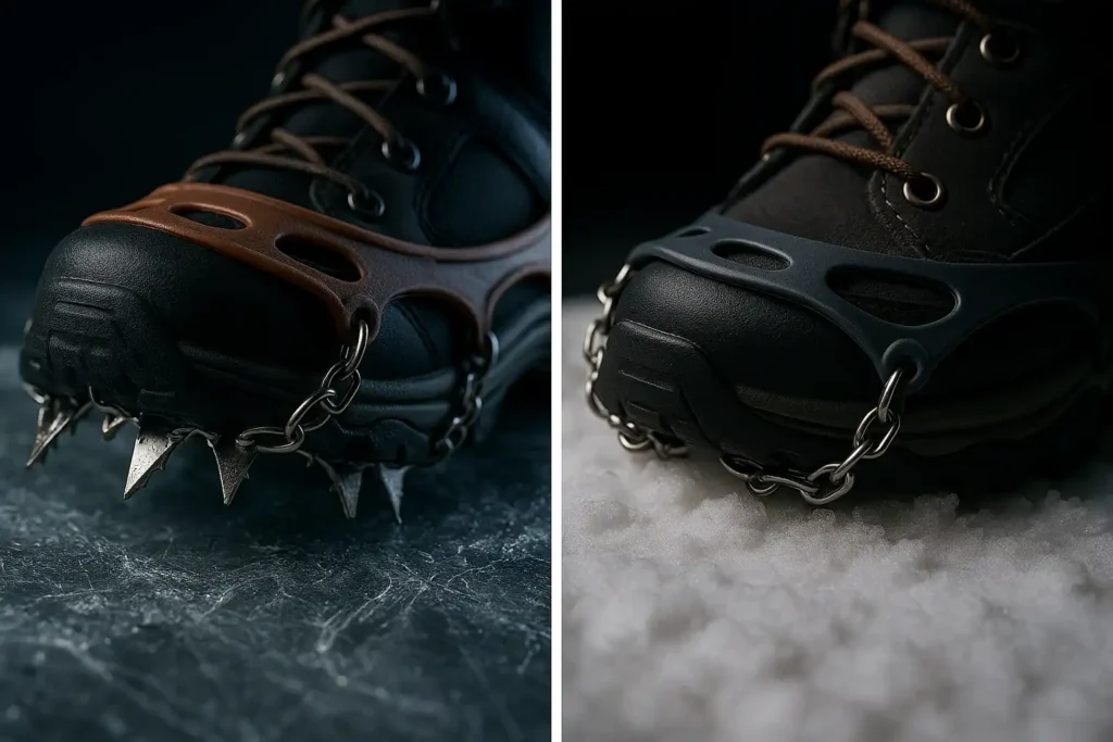 Les chaînes métalliques, alternative économique crampons élastomères, offrent traction acceptable terrain moyennement glacé. Leur conception simple (maillons acier entourant semelle) garantit fiabilité mécanique, aucun élastomère vieillissant susceptible casser -20°C. Le poids légèrement supérieur (400-450g/paire) et confort moindre (maillons moins anatomiques) représentent compromis acceptables pour budgets serrés.